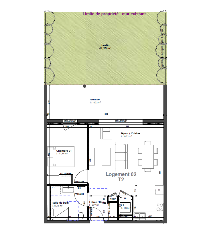 - Salle d'eau toute équipée (meuble vasque, robinetterie, radiateur sèche-serviettes)
